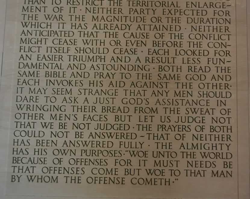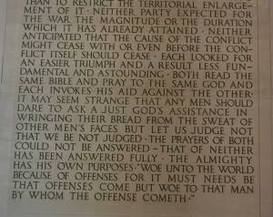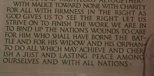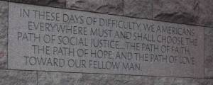 When we were in DC last month, we visited several monuments on the National Mall. We stopped by the Lincoln Memorial (always awe-inspiring) and saw the World War 2 Memorial for the first time. On our way around part of the Tidal Basin, we walked through the FDR Memorial. The quotes that were carved into the monuments were quite striking…