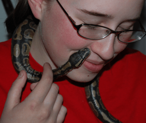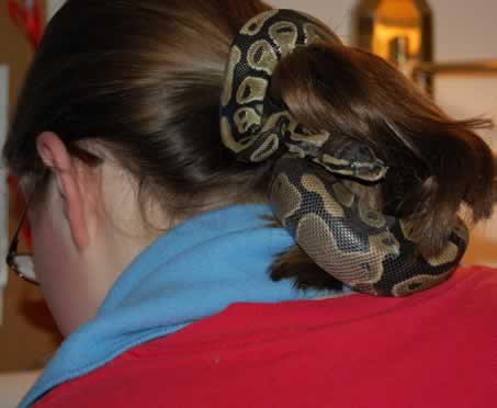We try to handle him at least every day because though he is comfortable being held, but it has to be done consistently. He’s fairly content with being a necklace, or in Harpist’s case, a hair scrunchie. As reptile pets go, it’s not bad.