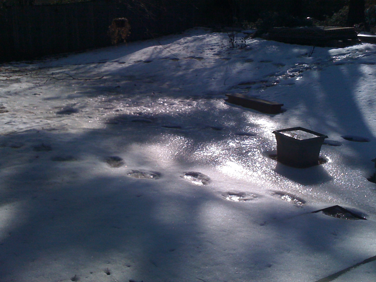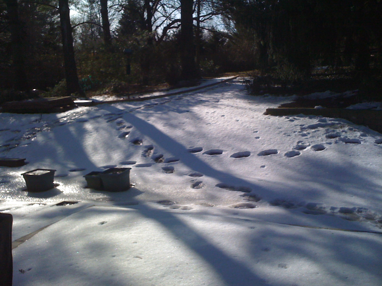 We did walk in the yard, refilling the bird feeder and taking out the compost. Those paths in the snow and ice, along with the travels of squirrels and such, were the only marks in an otherwise smooth frosting on the yard. Now, as the sun begins to do a little melting every day, it’s those places where we travelled that are melting down first. You can see pieces of dirt and grass underneath. It will all melt and spring will come.