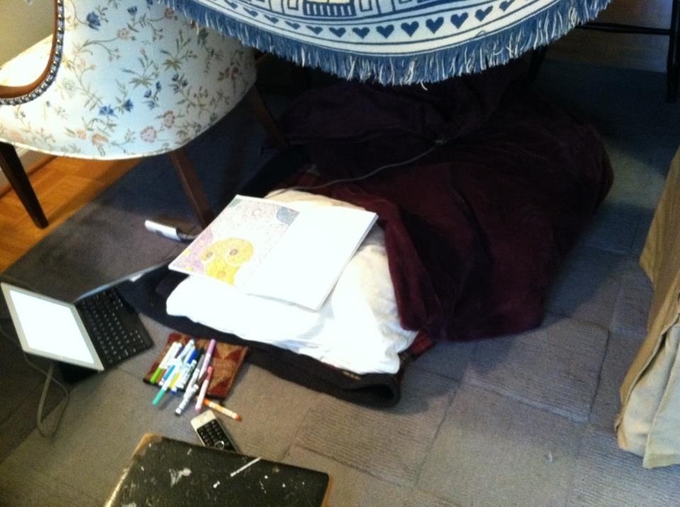 So, it was a day full of random inconveniences. And after I saw a meme about quitting adulthood and building a blanket fort, I decided I would… Complete with a charger for my phone, my tablet, and, yes, a coloring book. Because that’s how I roll…