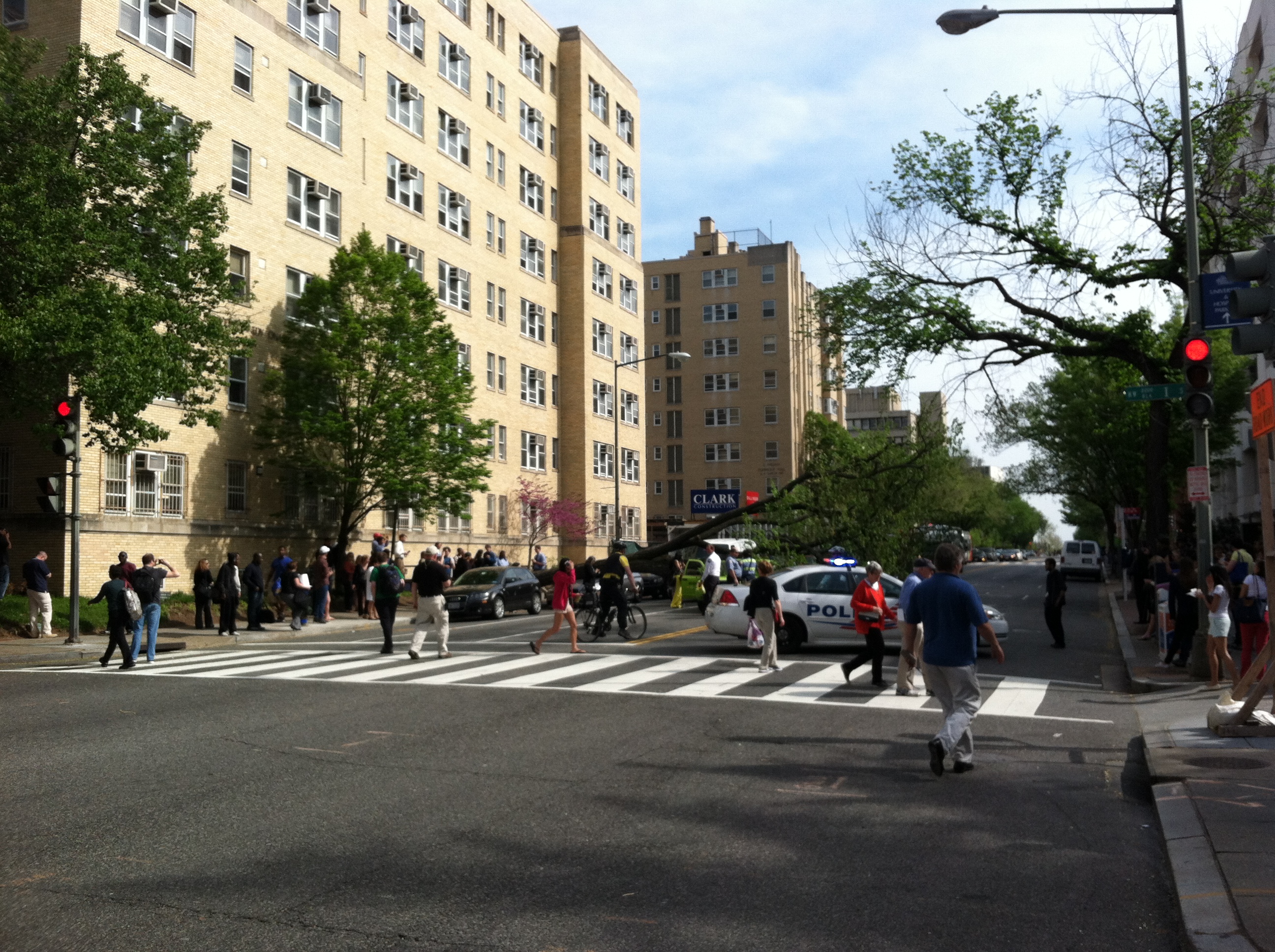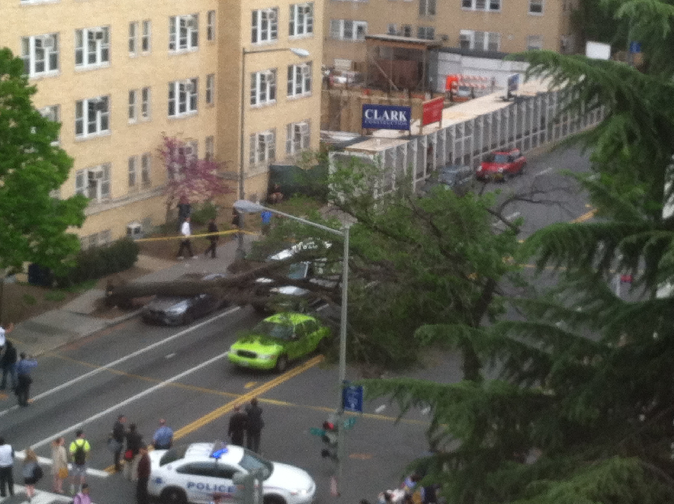Yes. Five minutes after I had sat in traffic, at that very light, next to the (now crushed) silver BMW, a tree toppled over across 6 lanes of traffic. A large, heavy tree. At first I laughed. Then I did what any decent city dweller would do: I snapped a picture. 🙂 Then I texted it to my family with a joke: “Hey, look where I DIDN’T park the car today!”