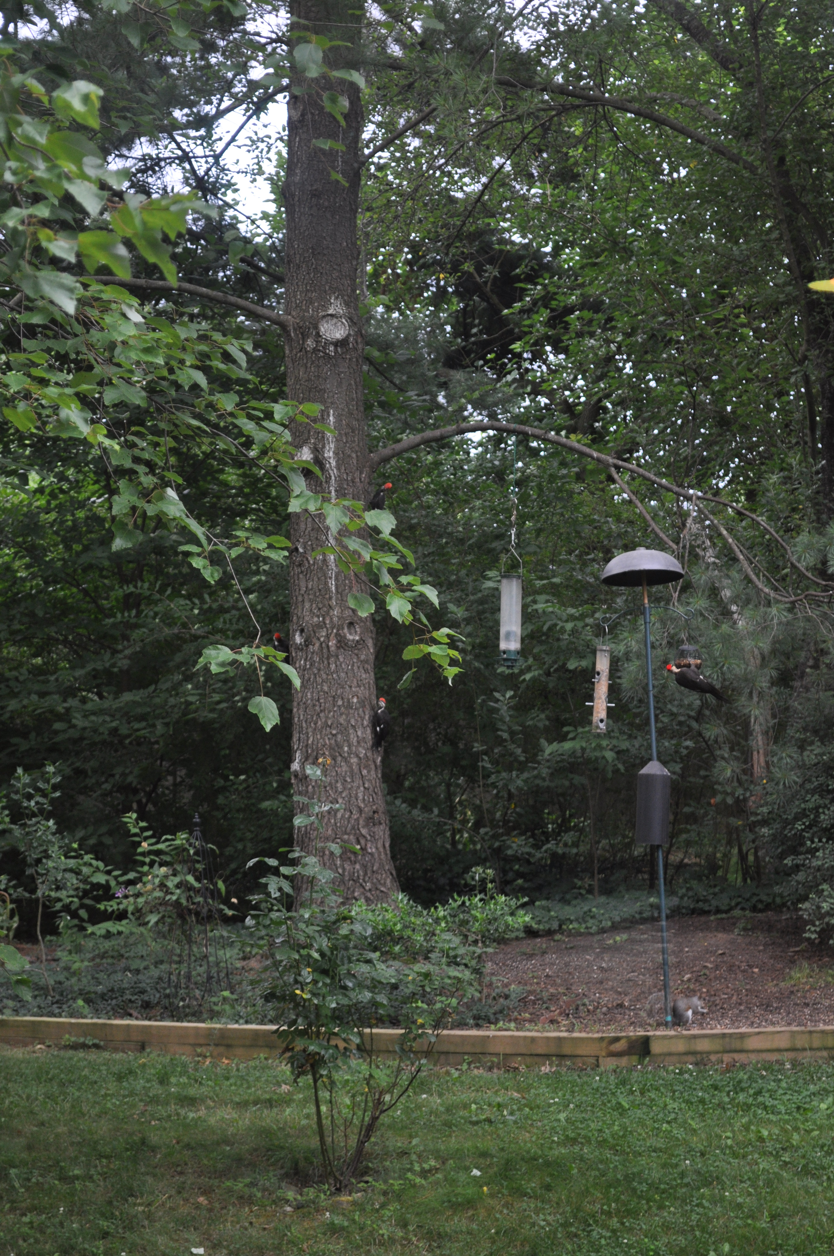 And here on the home front, the pileated woodpeckers brought the kids over to the breakfast buffet this morning. They can’t fly very well yet. There’s 3 juvenile woodpeckers on the pine tree, and an adult on the feeder.