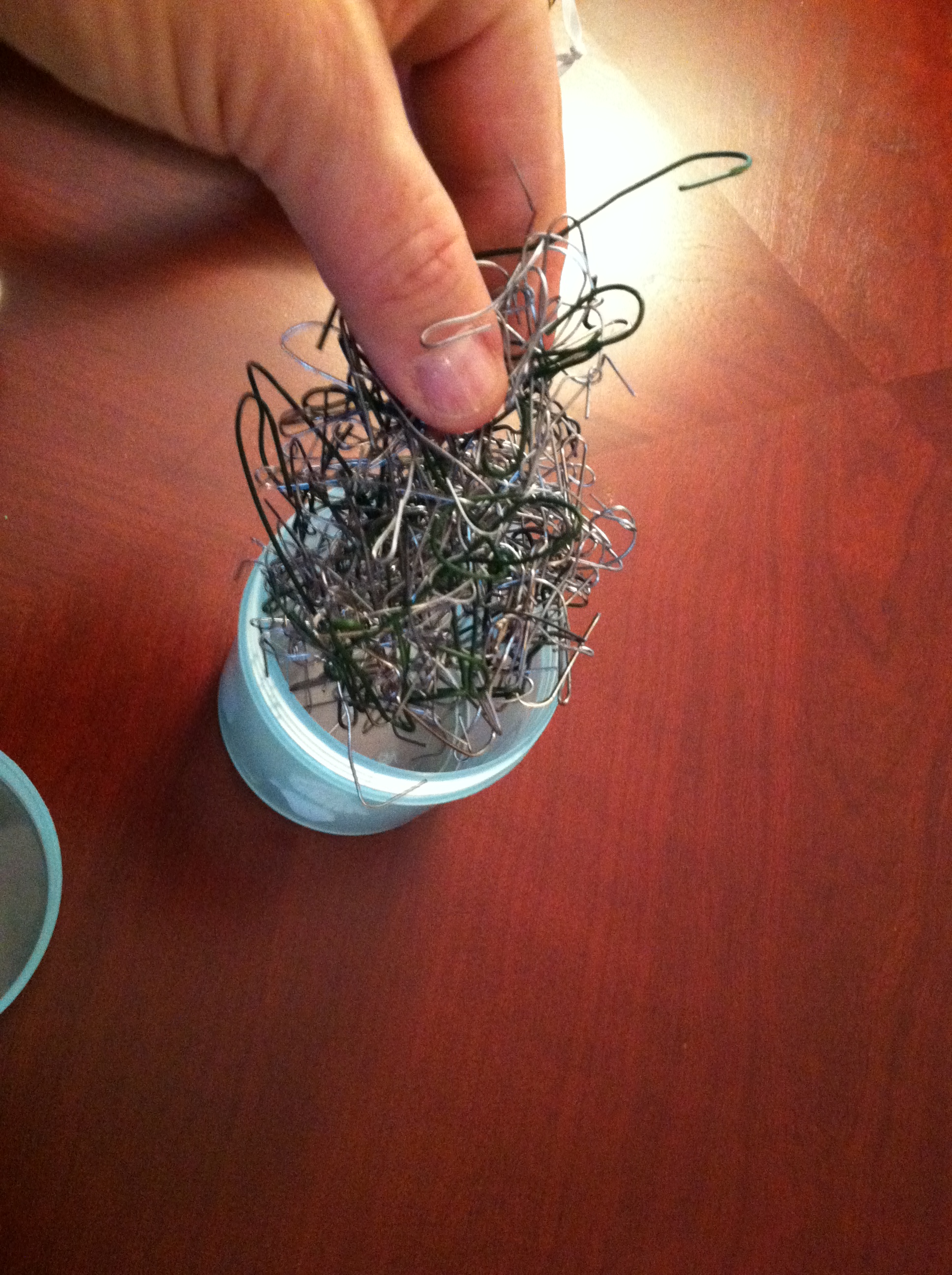 In the process of packing things up, I realized that I didn’t have to keep the tangled, impossible-to-use Christmas ornament hooks. One of our biggest frustrations when we decorate the tree is this mess of hooks that we have to painstakingly take apart. It’s not even worth the time to untangle them. So I was radical. I threw them away! Nope. Didn’t even recycle them.