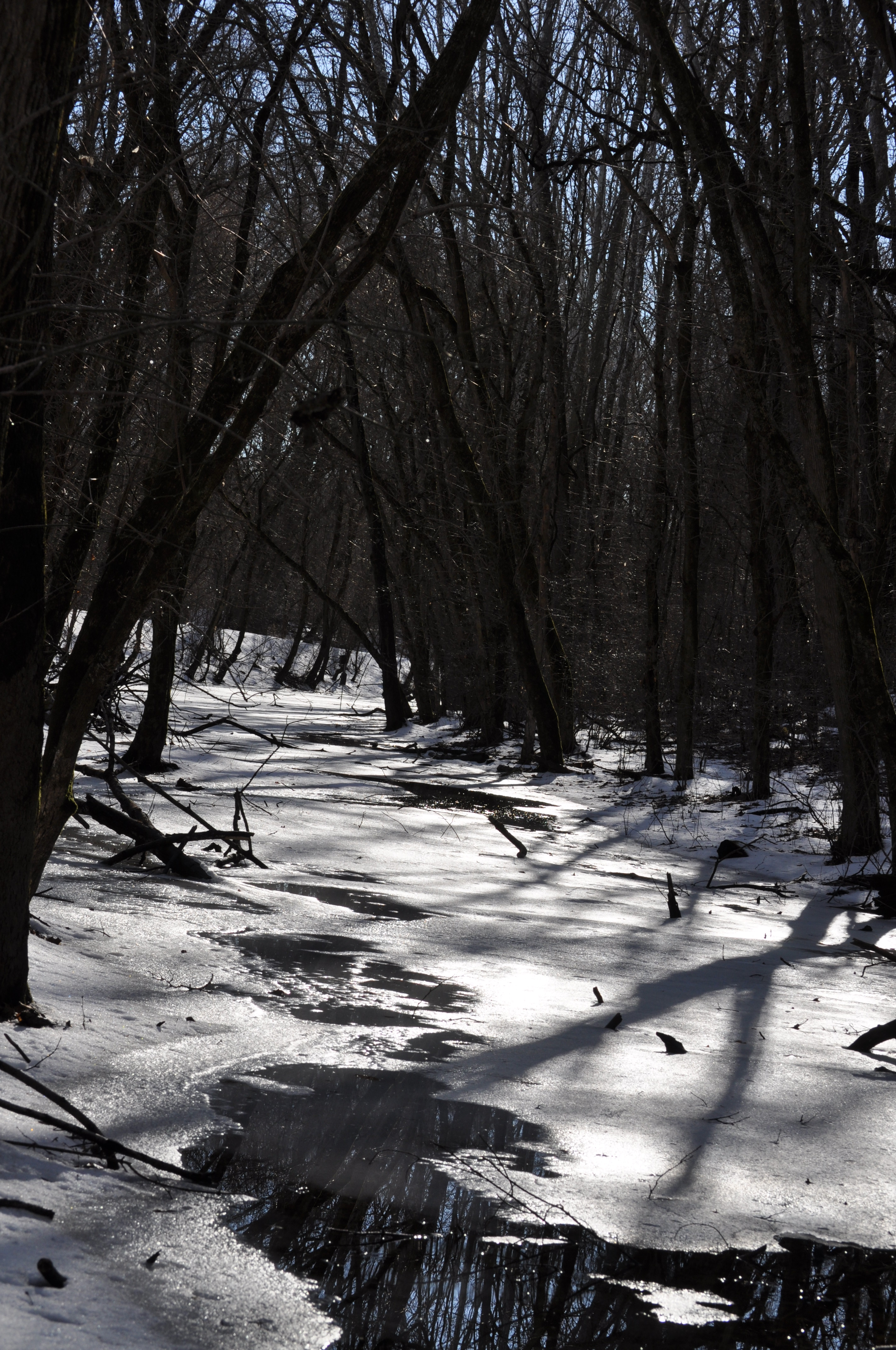 We walked in snow and ice through woods punctuated by hoof prints and bird tracks.