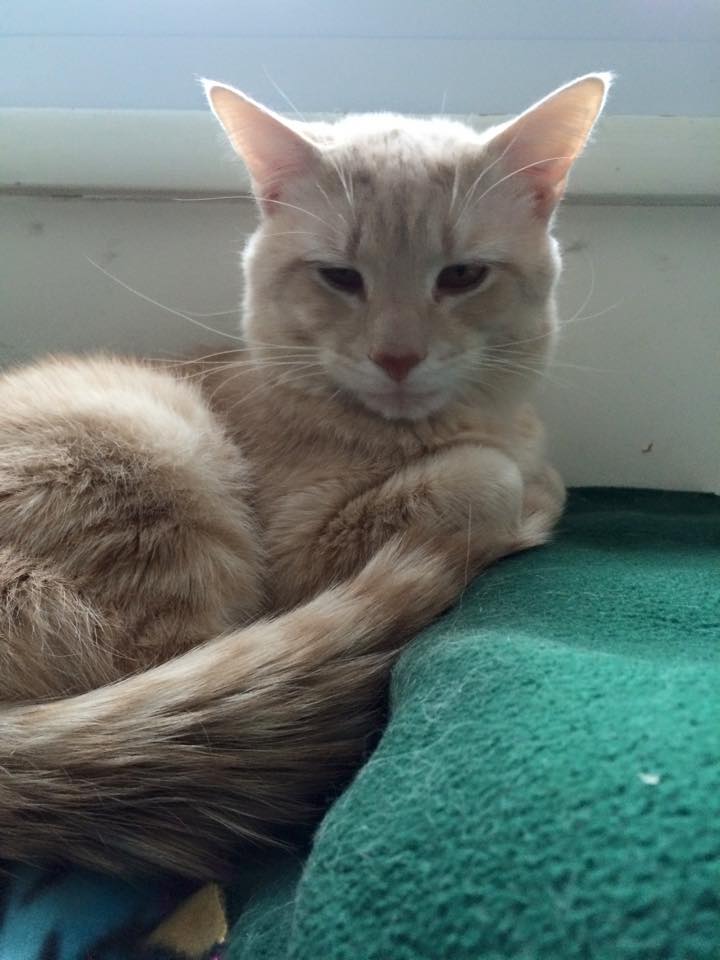 Jason was a stray and ended up at the County shelter. The no-kill shelter scooped him up and fostered him, had him neutered and brought him to their cat-house. (Imagine a house full of cat-trees, cat beds, and cat cozy spots. It was magical.) He was a little shy, but enjoyed our attention. He had dirty patches in his fur and some matted spots on his tail.