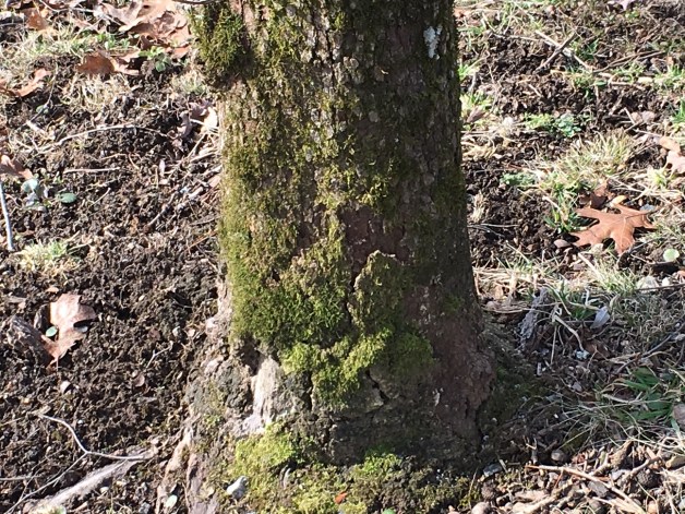 Just in front of my parking space yesterday was this mossy trunk of a stately oak tree. The grass wasn’t sprouting yet. The branches were bare, and last year’s leaves blew around on the ground beneath her. No sign of spring anywhere…