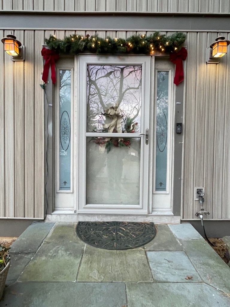 It may not look like it, but just one bough over the front door took over an hour and many, many trips up and down the step ladder. I replaced hooks, adjusted bows, and changed a few bulbs (you can tell this is an old decoration – there are bulbs to change!) I wiggled the stepladder from one side to the other.