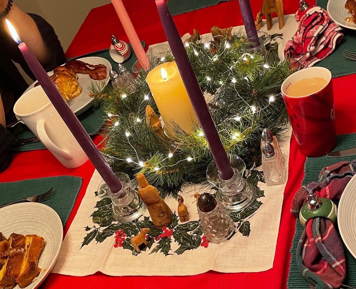 I put out a limited version of our crèche, made of olive wood from Bethlehem. I managed to find the Advent wreath before Week 4 of Advent, which was a small victory. (Truthtelling: we didn’t light the candles until Christmas Eve!) I found the Christmas linens, too, in time for our family meals together. And honestly? It was OK.