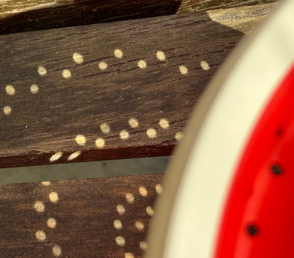 Trusty Eclipse-o-scope (aka a strainer!) in hand, I sat on the back patio yesterday, watching the birds as they seemed to go into nighttime mode with less activity and quieted songs. I didn’t have eclipse safety glasses, so I watched the shadows change, the round circles in the strainer become crescents, and the overall light fade. Just as quickly, I saw the birds’ activity return to regular levels, and their songs surrounded me. The verse that came to mind was a Psalm that I read more than once in the infusion chair…