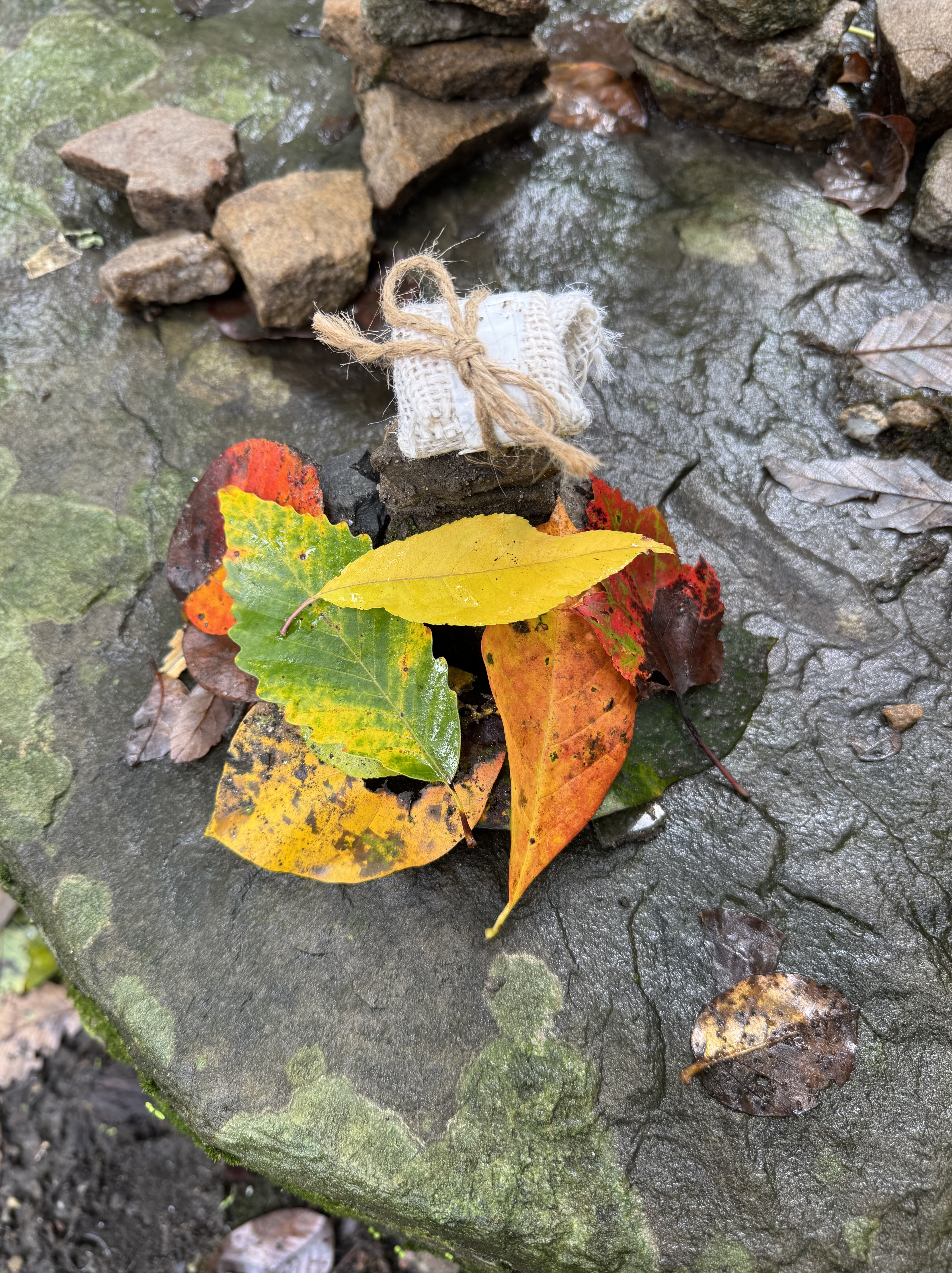 On the one year anniversary of Ken’s death, I made time for a weekend Silent Retreat, where I worked through some of these stormy waves. I built a cairn in the Zen Meditation Garden. I topped my small pile of rocks with a memory stone I created at home, wrapped in burlap and tied with cotton twine. I set it down with thankfulness, tears, and acceptance of the spaces that I’m going to move into now. Before I left the garden, I decided I couldn’t just leave rocks… I found colorful leaves all over the garden, and carried them back to surround the cairn. Ken, a lover of trees and all things Tolkien, would have approved, I think.