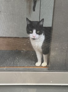 Stewart, of course, as OPINIONS as to why I should not be outside. He has been fed his breakfast (those sad eyes are lying!) but he would like to explore the morning with me. The problem is, he is not willing to wear a harness… so I am not willing to risk his bolting off into places unknown.
